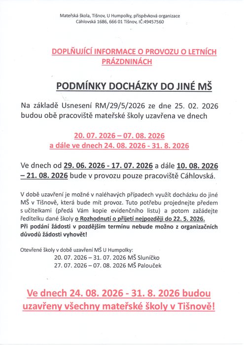Sdělujeme rodičům, že v případě docházky do jiné mateřské školy o prázdninách, je potřeba se nejpozději do 22. 5. 2026 nahlásit. Bližší informace v přiloženém souboru.