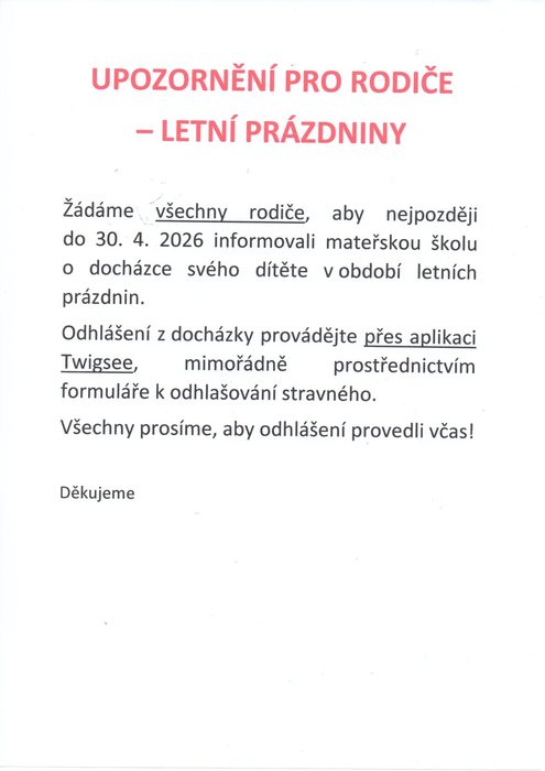 Žádáme rodiče, aby včas odhlásili děti na letní prázdniny. Více v přiloženém souboru.